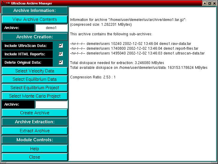 Load an existing archive from the archive directory (see Ultrascan Configuration for details) and view the contents. There can be up to three sub-archives in each main archive representing different groups of related data files (see Archive Creation, below). When viewing an archive, all available sub-archives will be shown in the report window, as will be the filename, the size of the archive, the compression ratio and the amount of diskspace needed to extract the archive. The program will also compute the amount of diskspace available to the user on the filesystem that has been configured for the export of the data. It is assumed that the data will be restored to the same filesystem as the configured data directory. If the available diskspace is not sufficient for extraction, a warning message will be printed and the user will be alerted to free up some diskspace before proceeding to extract the archive. |