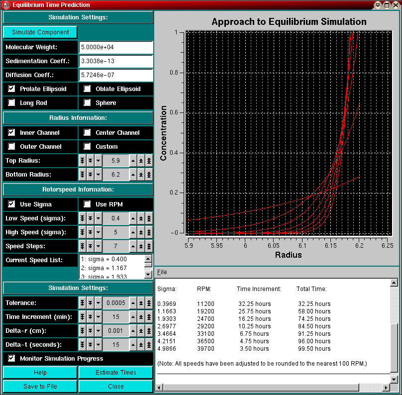 When simulating these times, you should simulate a molecule that is sedimenting slightly slower than the actual molecule, perhaps by simulating a system with a larger frictional ratio or larger axial ratio, and perhaps a nonglobular model rather than a spherical model. While the equilibrium times may be longer than needed, at least they won't be too short. In this module you can change the parameters that influence the time it takes to reach equilibrium.