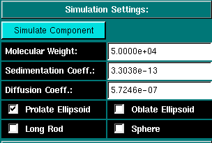 Simulation Settings: Before you can simulate the equilibrium times, you will have to define the molecular parameters for the system to be simulated. Clicking on this button will invoke an UltraScan module used for the prediction of s, D and f from the estimated molecular weight for 4 basic shapes. Once the system is defined in this module, the values will be automatically transferred to the equilibrium times prediction module. The molecular weight of the simulated component. The sedimentation coefficient for the simulated component. The diffusion coefficient for the simulated component. These are the possible models for the selected molecular weight. Selecting the prolate ellipsoid (default) will handle most cases, even spherical molecules with a small time penalty. It is therefore a good default setting. |