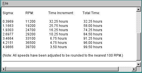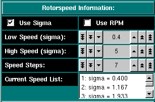 Rotorspeed Settings: Select if you want to enter the speeds in terms of sigma (reduced molecular weight term: [(M * omega^2 * (1 - vbar * rho))/ 2 * R * T]) or by RPM. Either unit will be interconverted. Check this program for appropriate speeds. Select the first speed to be equilibrated Select the last speed to be equilibrated The total number of speeds to be simulated, including the high and low speed. These will be chose linearly spaced between the high and low speed. All selected speeds will be listed here.