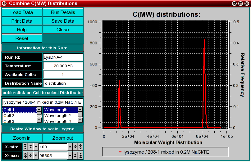 This program enables you to combine multiple molecular weight distributions from the C(s) analysis into a single plot. You can combine multiple datasets (either from different cells of the same run or from different runs) by using the "Combine C(MW) Distributions" item from the Utilities menu. This will allow you to compare molecular weight distributions (which are derived from integral distributions) from different runs and different cells to each other. This may be useful if you analyzed the same sample under different conditions, for example, different pH levels or different concentrations. If the samples are the same, the distributions should overlay, if the samples behave differently, the distributions will be shifted against each other.