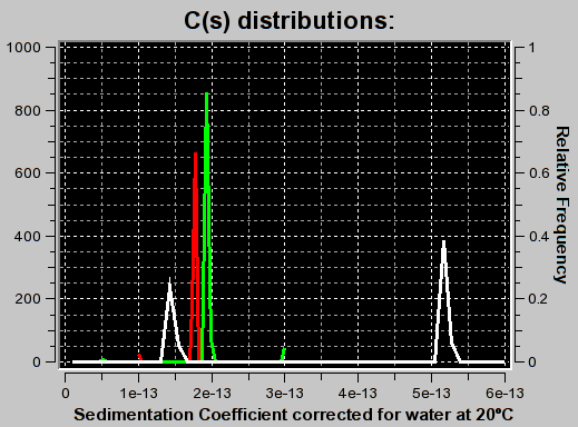 Important Note: In addition to uncertainties about multiple peaks in the distribution, there is another problem users of the C(s) analysis need to be aware of: The molecular weight and diffusion coefficient distributions generated by the C(s) method are based on a single f/f0 value either set or fitted in the C(s) analysis, and on a single vbar value identified with this run. If either the vbar or the f/f0 value is incorrect, the molecular weight and diffusion coefficient distributions will also be incorrect. In general, it is unlikely that multiple components in a single experiment will have the same f/f0 value. This unlikelyhood is translated into the reliability of these distribution. If only a single component is visible in the distribution it is more likely that the value determined for f/f0 is correct.
