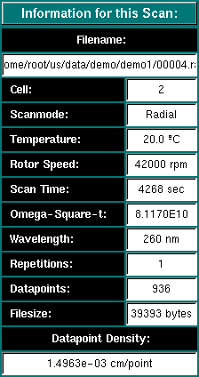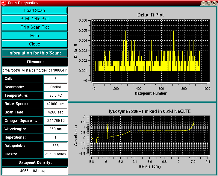 The scan diagnostics utility can be invoked by clicking on the "Diagnostics" entry in the Utility Menu from the Main Menu of UltraScan. The purpose of this module is to present the parameters and contents of a scanfile in a graphical way. In absorbance scans, radial scans are measured with varying radial increments. Since the radial increments are not constant, this module will show the radial increments as delta-r plots. In addition, all parameters are extracted from the file header and shown.