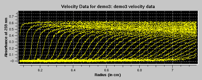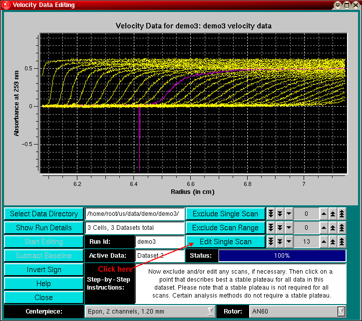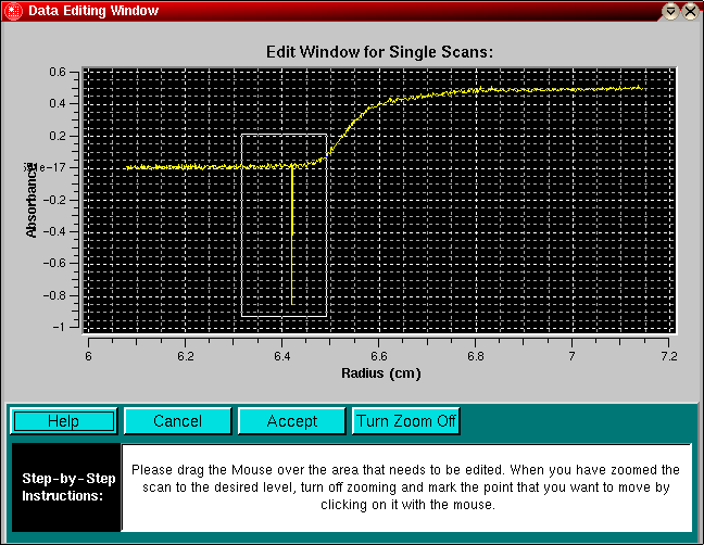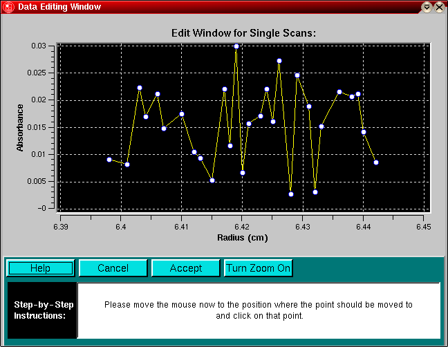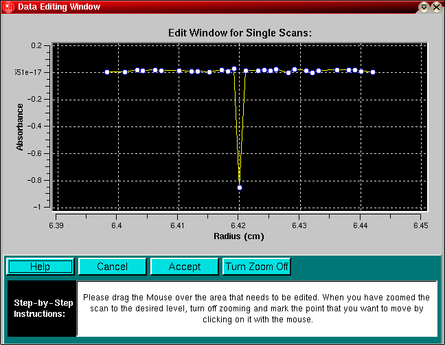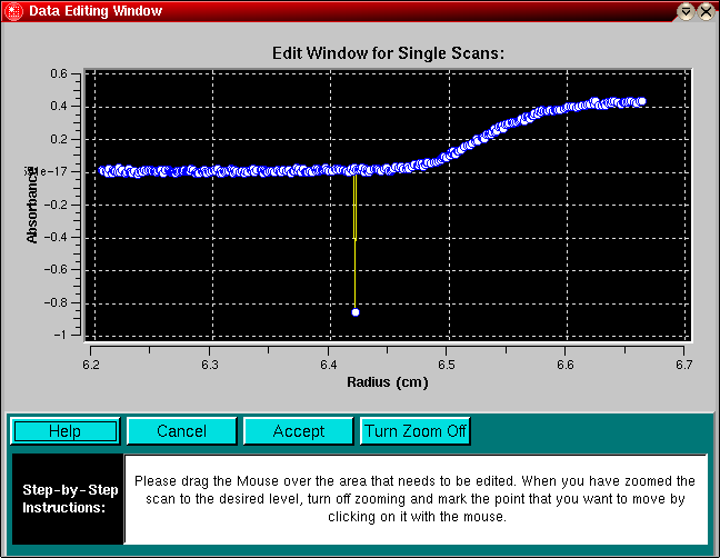The purpose of this routine is to allow editing of experimental data with flaws such as spikes and scratches. These imperfections occur from time to time, either due to electrical noise in the data acquisition system, due to failed lamp flashes, missing CCD points or scratches in the cell windows. Eliminating such imperfections is appropriate as long as the overall shape of the concentration gradient is not altered.