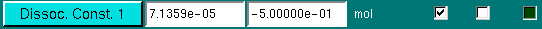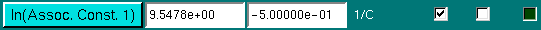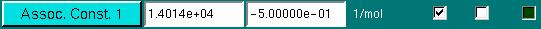Association constants can be displayed in one of three ways. The default measure of displaying the association constants is as the log of the association constant in absorption units. If an extinction coefficient different from unity has been entered (see below for details), the association constant can also be displayed in concentration units, or as a dissociation constant. In order to change the display mode, simply click on the association constant of interest: