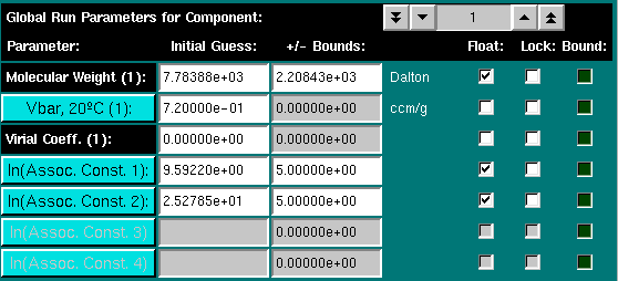 Global parameters include the molecular weight for each species, the partial specific volume of each species, the second virial coefficient for each species, and the association constants for the model, if any. You can float either the molecular weight or the partial specific volume (vbar) of the particle, but not both at the same time. To set the parameters for any given species in a multicomponent model, click on the "Global Run Parameters for Component:" counter. To set the partial specific volume for each parameter, either enter the value corrected for 20oC into the dialog, or click on the "Vbar, 20oC" button. This will call up the vbar calculation module.