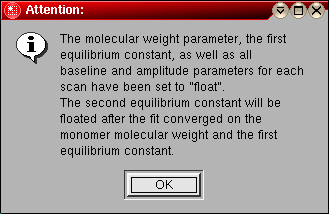 After initializing the parameters for the fit, you should either manually select parameters to be floated by selecting the "Float" checkbox for each parameter you want to be floated, or click on the "Float Parameters" button, which will automatically set all applicable parameters to be floated. A message window will pop up to inform you which parameters have been set to be floated. After clicking on "Float Parameters", the "Check Scans for Fit" button will be activated, and can be used to perform a test, which will confirm that the fit is properly initialized.