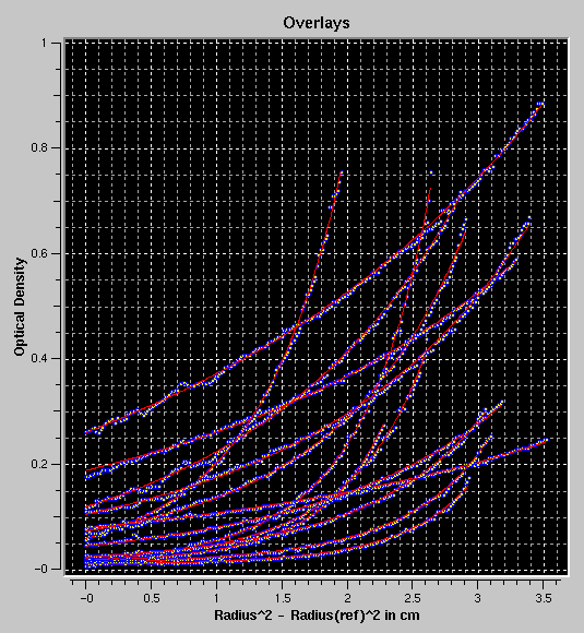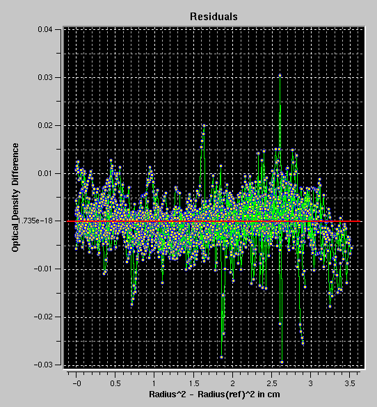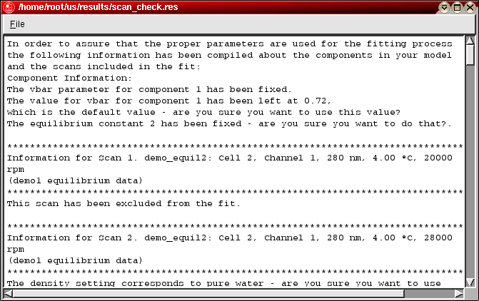 For each scan, individual fitting results and statistics are shown. Excluded scans are indicated. Besides the static parameters for each scan, amplitude, baseline, buoyancy, extinction coefficients and density settings are shown. Integrals corresponding to the relative concentration of the component(s) in the sample are calculated. These integrals are based on the area under the modelled curve between the meniscus (as defined in the editing of the equilibrium run) and the bottom of the cell (as defined by the centerpiece geometry and the rotor stretching, which is calculated based on the rotor selection used in the editing program). Individual fitting statistics are also shown: