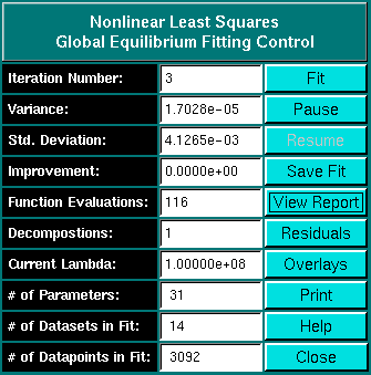 Should you decide to perform a Monte Carlo analysis on your fit, you will need to first save the fit by clicking on the "Save Fit" button in the fitting control window. Next, you can click on the "Monte Carlo" button in the Model and Fitting Information section of the Global Equilibrium Fitting Window. More information on the Monte Carlo analysis is available here, a Monte Carlo tutorial is also available.