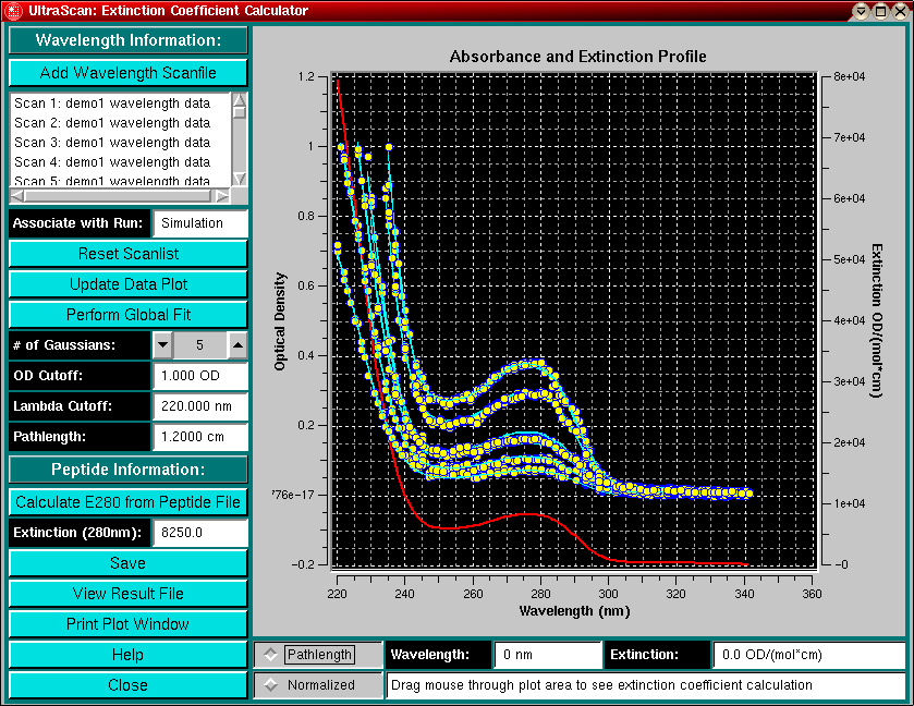 A simple approach to determine the extinction coefficients of a protein at wavelenghts different from 280 is to measure the absorbance of the protein over a larger wavelength range at multiple concentrations and then fit the data globally to a "best-fit" extinction function that describes the protein's extinction properties at each wavelength. The approach chosen in this module is to measure the absorbance profile of a protein at several different concentrations over the wavelength range of interest, which can easily be accomplished with the XLA. The resulting wavelength scans are then fit to a global extinction profile using sums of Gaussians, which are weighted by multipliers, representing the concentration of the sample in each scan.