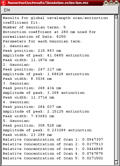 Save | Save the current fit to file. Two files will be saved: The first file contains the wvalength and extinction data, normalized by the E280 entry, in an X/Y-plot format (ASCII). The second file contains the fitting results for the linear combination of Gaussian terms. |