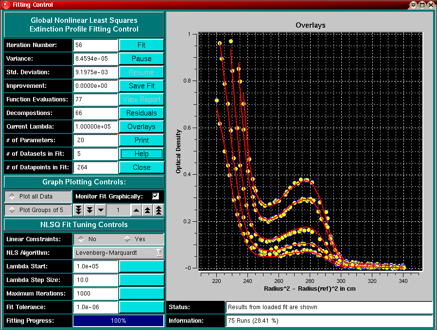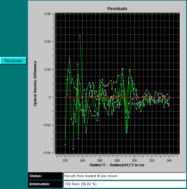 | Perform Global Fit | After selecting all scans to be included in this fit, click here to start the nonlinear least square fitting process. The Extinction Fitter Control Panel will be displayed. For more information on nonlinear least squares fitting, please click here. After fitting, the scans will be displayed with the best fit overlayed. Residuals of the fit can be displayed as well. Residuals and overlays can be toggled by clicking alternately on the "Residuals" or "Overlays" buttons. | |