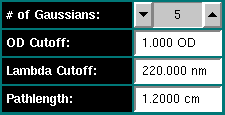 The program will crop valid data (within reasonable absorption limits, generally 0.0 - 0.9 OD) from each wavelength scan and fit it with a global fitting function composed of sums of Gaussian distributions with different amplitudes, peak positions and peak widths. The global function is then multiplied with a floating scalar which represents the concentration of the scan's sample.