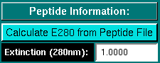 Calculate E280 from Peptide File | Clicking on this button will call up the Peptide Calculation Module, which allows you to estimate an extinction coefficient for 280 nm based on the method by Gill and von Hippel for measuring the partial extinction of denatured peptides at 280 nm from the amino acid composition. By default, this value is set to unity, adjusting this value will scale the entire profile to an extinction value proportional to the 280 nm value. |
