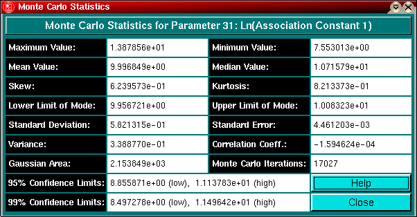This panel shows the various statistical measurements for the Monte Carlo distributions of each parameter.