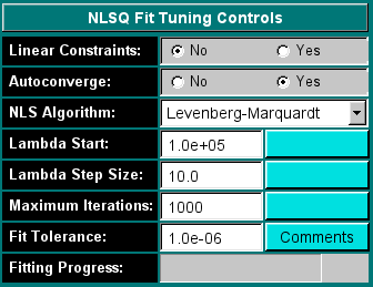 Iteration Number: | The program will keep track on each nonlinear least squares iteration and list the current iteration here. The program will abort if the maximum number of iterations has been reached. The maximum number of iterations can be adjusted in the "NLSQ Fit Tuning Controls" (see below). |