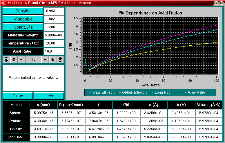 You can start this model from the Simulation Menu entry in the Main Menu. Given a molecular weight, partial specific volume, and an axial ratio, this module allows you to model the molecular dimensions of a sphere, prolate ellipsoid, oblate ellipsoid and a long rod. Further, by providing the buffer conditions and temperature observed in a sedimentation run, this program will calculate the sedimentation, diffusion, and frictional coefficient for these hypothetical models.