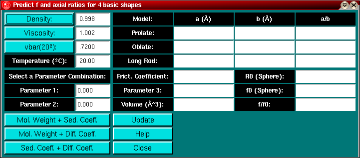 To use this module, select any single combination of parameters by clicking on the respective button, and then enter the parameters under the field for parameters 1 and 2. Next, click on the Update button to calculate the molecular dimensions for a sphere, an oblate and prolate ellipsoid, as well as for a long rod. Also calculated are the frictional coefficient and the frictional ratio, f/f0, which is a measure of how much a sample deviates from the frictional properties of a perfect sphere.