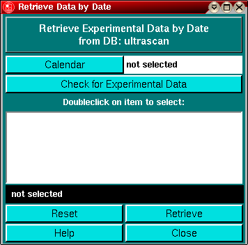 This function allows you to retrieve experimental data from the database by searching for any data by the date of the experiment. Simply enter the date or click on "Calendar" to select a date from a calendar dialog. Next, click on "Check for Experimental Data" to find any data acquired on that day in the database. If any data was found, it will be listed in the listbox by name and description. Once you found the correct experiment, highlight the entry and click on "Retrieve" to retrieve it from the database to your harddrive.