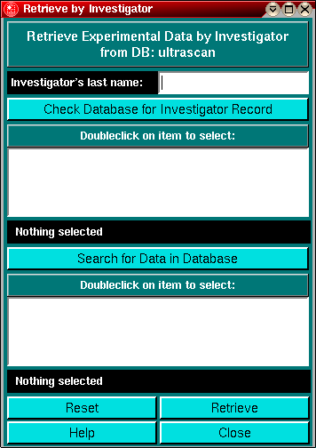 This function allows you to retrieve experimental data from the database by searching for the name of the associated investigator. Simply enter the investigator's last name and click on "Check Database for Investigator Record" to find the investigator in the database. Next, double-click on the desired investigator record. Then you can click on "Check for Experimental Data" to locate all datasets associated with this investigator. They will be listed in the lower listbox by name and description. Once you found the correct experiment, highlight the entry and click on "Retrieve" to retrieve it from the database to your harddrive.