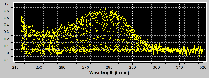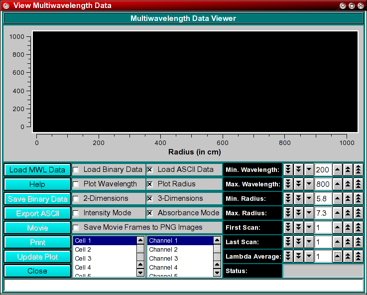 The Multiwavelength Data Viewer is used to import, display and export ASCII and binary multiwavelength data from the second generation multiwavelength optics developed at the Max Planck Institute for Colloids and Interfaces in Golm, Germany, by Helmut Cölfen's group. The viewer is started by clicking on "View/Edit Multiwavelength Data" in the Edit sub-menu of the main menu, loading up the viewer.