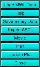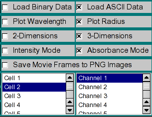 The binary/ASCII load descriptor control if binary or ASCII source data are loaded. Both contain the same information, but binary data needs to be saved first. The next item selects what information is displayed in the 2-D plots or processed in the movies. The option is for wavelength vs. radius plots ("Plot Wavelength)are shown or radius vs. wavelengths plots ("Plot Radius). The next item controls if updates or movies apply to a 2-dimensional representation or a 3-dimensional representation. The data mode (Intensity vs. Absorbance mode) determines the control flag written to the binary data (which is not contained in the ASCII data). Clicking on "Save Movie Frames to PNG Images" allows you to save all frames of a movie to individual PNG images. See above descriptions for items 1-7 for further details. |