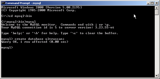Now lets create the database. For demonstration purposes we are naming the UltraScan database ultrascan. If you want to name it something else, use this format: