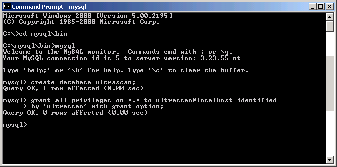 The above instructions will let the ultrascan user connect from localhost (which is the computer UltraScan is running on). If you want the ultrascan user to connect from another computer you will need to add an additional line following the last command: